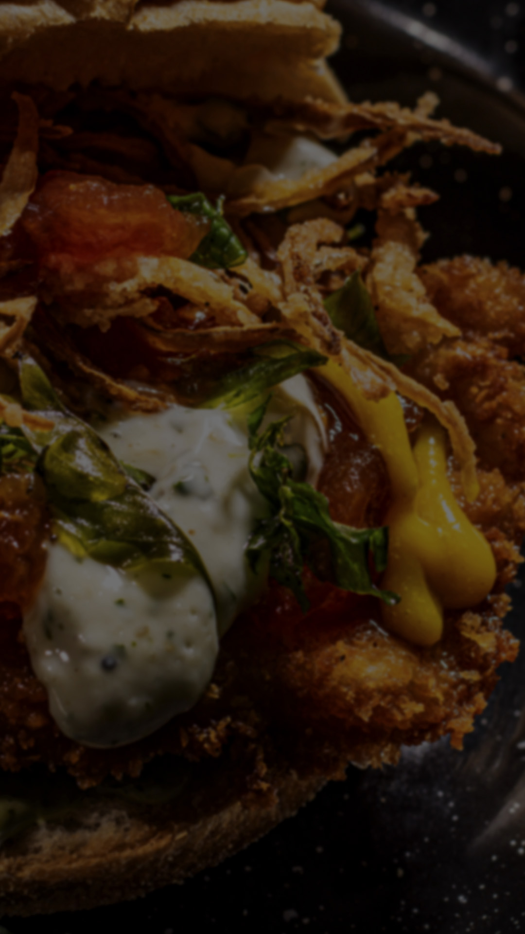 Pan artesanal, filete de pollo apanado, albahaca, mermelada de tomate cherry, cebolla crispy, salsa tártara, mostaza y papas fritas.