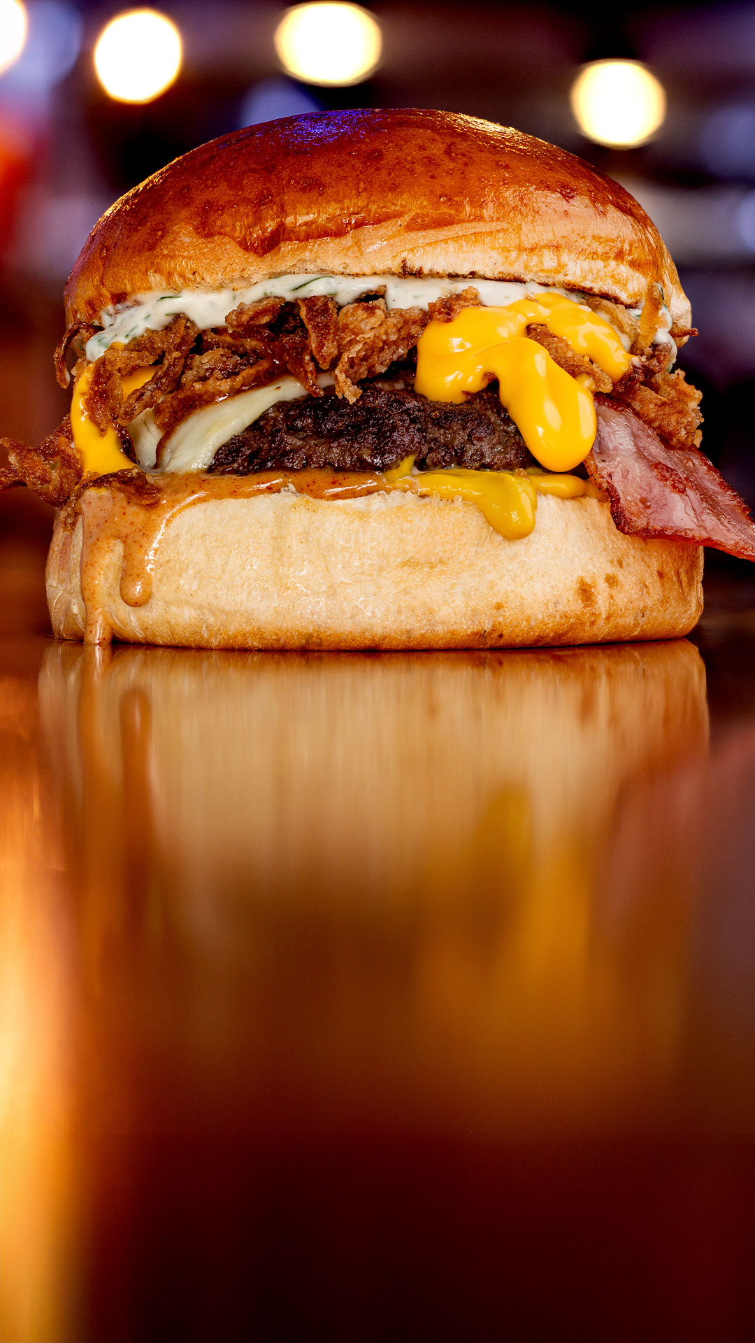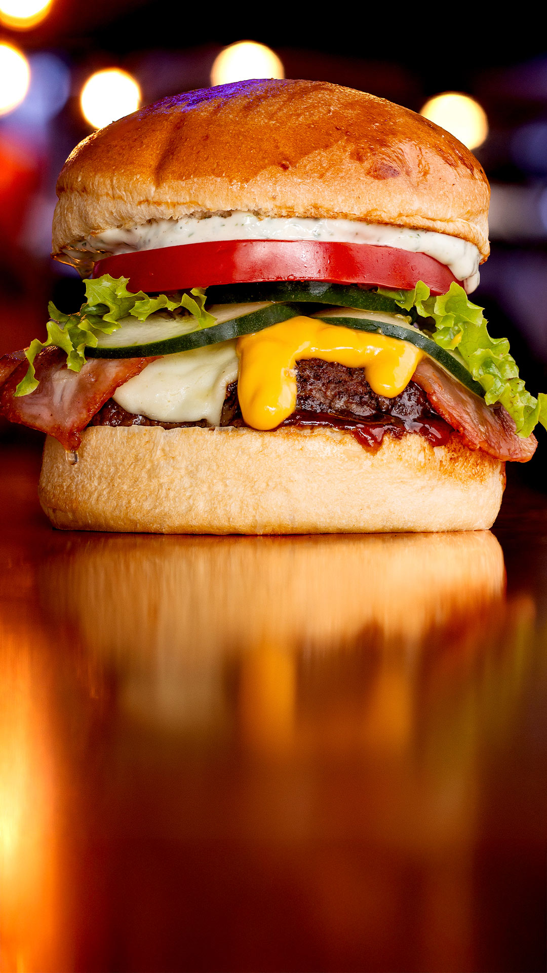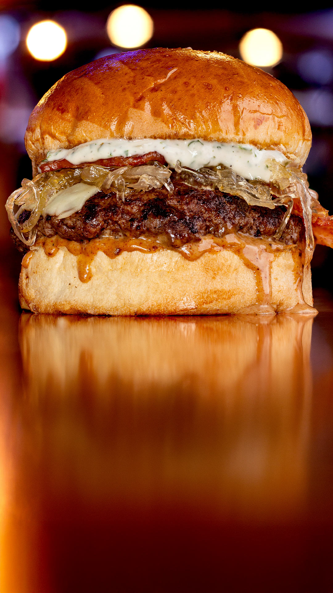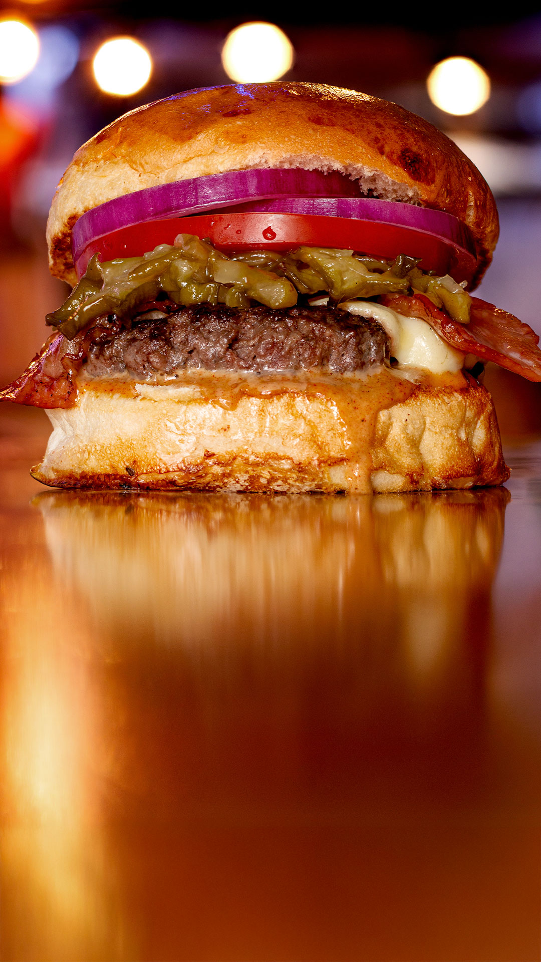 Carne Angus de 150g, pan artesanal, queso mozzarella, pepinillos caramelizados, tocinetas crujientes, aros de cebolla morada, tomate, lechuga, mayonesa de la casa y salsa golf, acompañada de papas fritas.