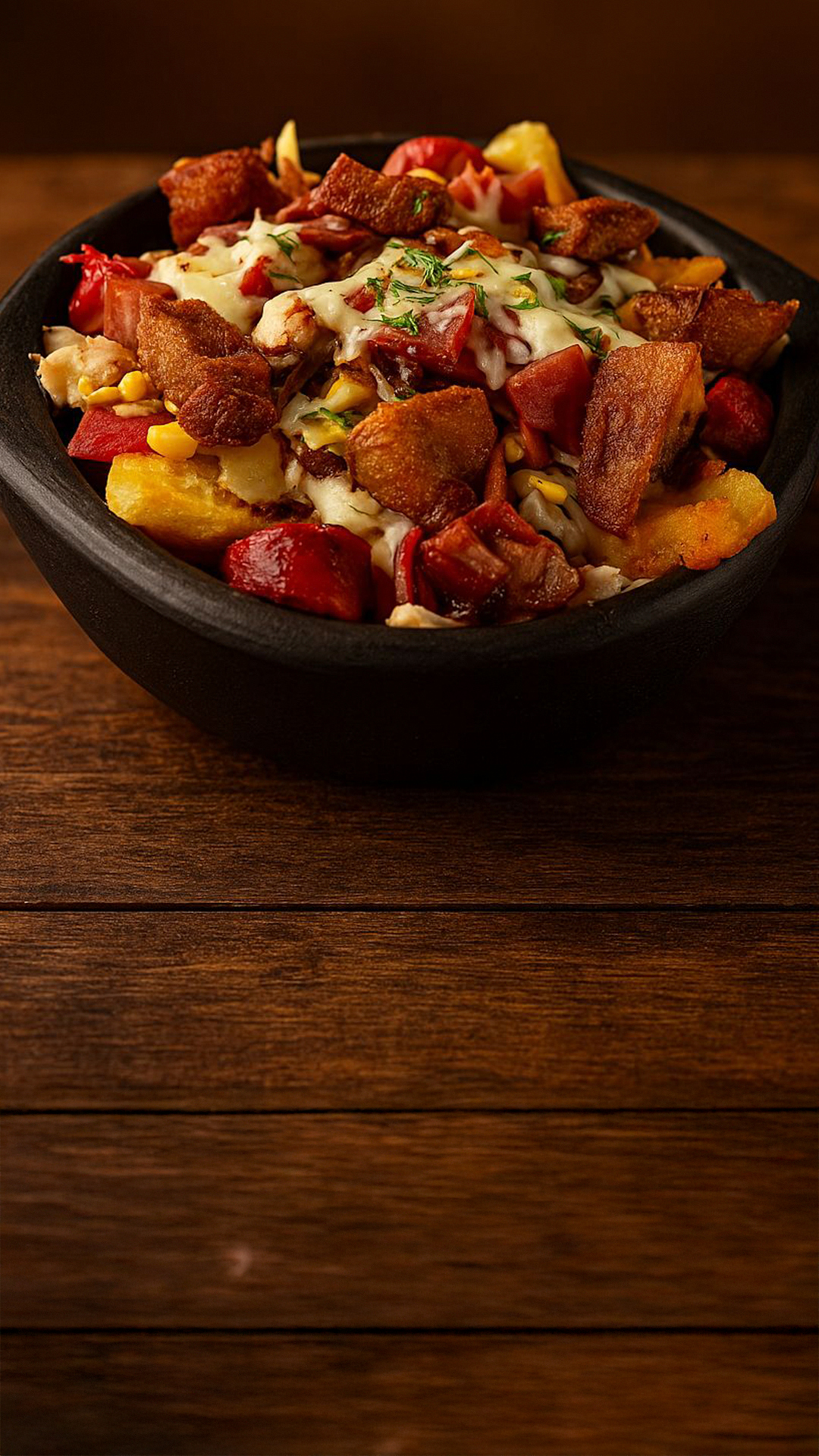 Papas casco, chorizo, birria, pollo, costilla, chicharrón, maicitos, mozzarella, salsas de la casa.